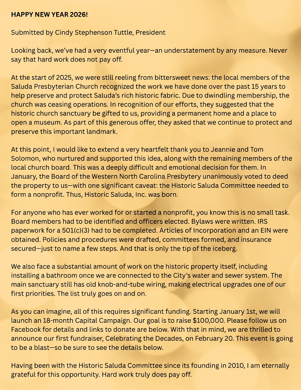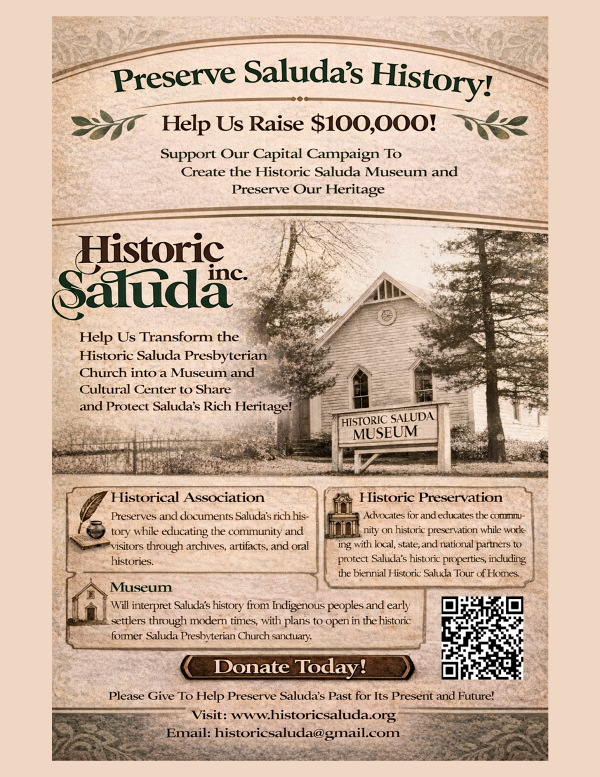 For 15 years, the Historic Saluda Committee has partnered with the City of Saluda to advance preservation and celebrate the town’s rich history. Building on this legacy, we have taken a bold step forward by forming a nonprofit organization—Historic Saluda, Inc.