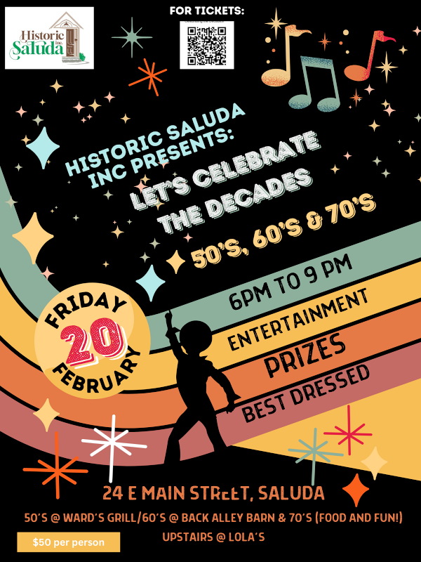 Step back into the groovy spirit of the 50s, 60s and 70s as we kick off the capital campaign for the new Historic Saluda Museum & Historical Society! Join us for a night of nostalgia, community, and exciting plans for preserving Saluda’s rich heritage. Your presence—and your support—will help make history happen.